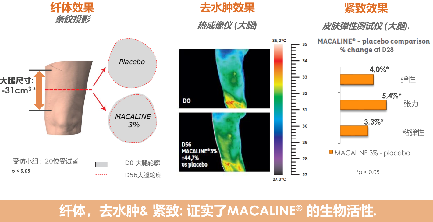 • 含有3% MACALINE ® 的膏霜vs 安慰劑 /腿部每天使用2次,共計56天