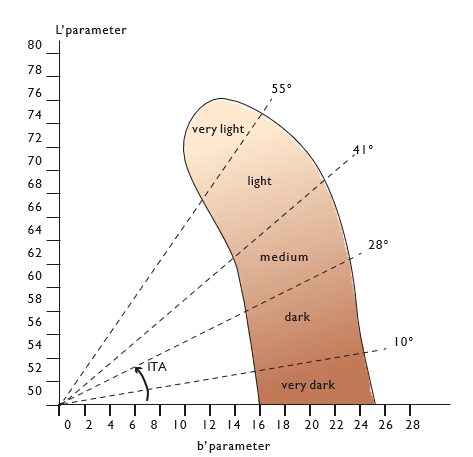 皮膚的顔色采用色度計測量。 設備定義亮度參數:L *,淨度,黑度到白度和色度; 因子(zǐ):b *,從藍到黃(huáng)的光譜。用既定參數求證個(gè)體(tǐ)類型學角度,即個(gè)體(tǐ)皮膚的色素沉着的程度。